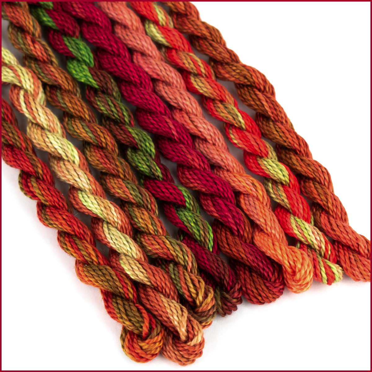 Size 3 Perle Sampler #2 is a mixed sampler of size 3 perle cotton. There are 8 skeins each measuring 9 meters (9.84 yards). All skeins are different colour combinations and no two are repeated.